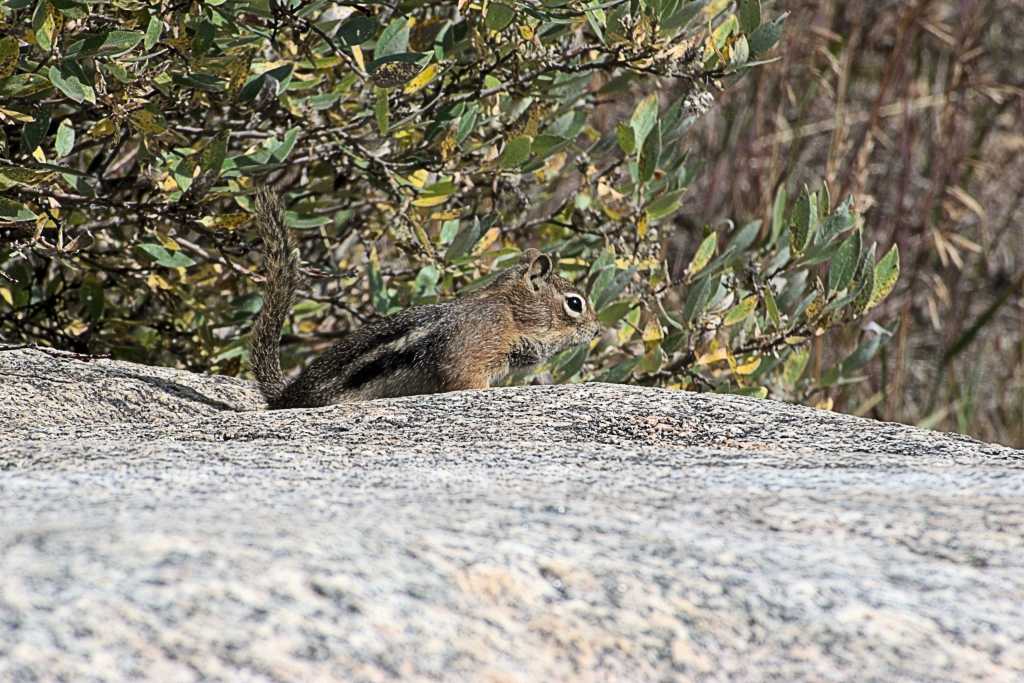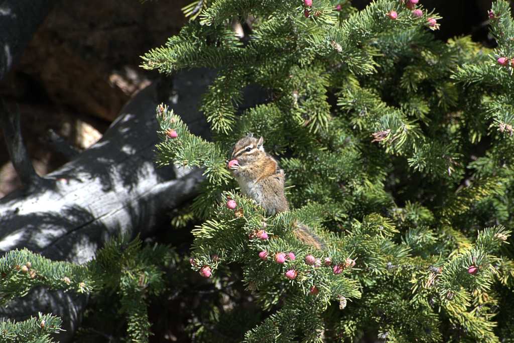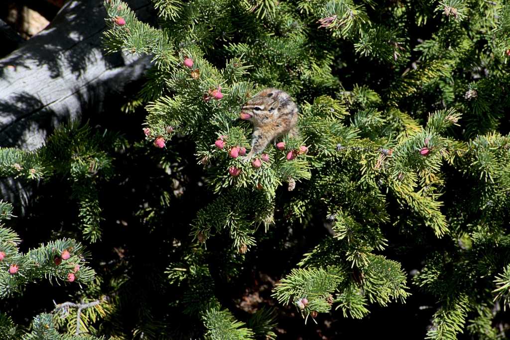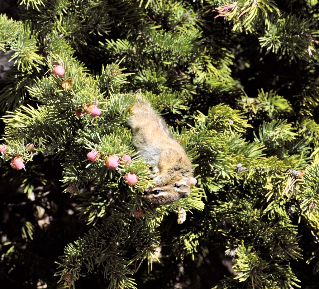 My sightings of the Least chipmunks were at two locations while I was at Echo Lake and Mount Evans. I would see them daily around the Lodge and occasionally in the pine trees at the one mile marker on route five. The chipmunks at the one mile marker were highly animated when I saw them either eating or just sunning on a pine tree branch. I would often stop at this location to catch a second breath, check my gear and most importantly take the time to appreciate the wilderness. Just shy of the three mile marker is the Mount Goliath Nature Center at an elevation of 11,500 feet and an end to the tree line. You will not find chipmunks beyond this point as there is simply no food supply for them. The marmots are the rodent potentate at this point and higher elevations, they are much bigger than the chipmunks who would not fare well in competition for food and territory. I have been fortunate while on my many WaltAbouts to see one of the smallest mammals in the state the Least chipmunk which comes in at about 2 ounces to the mighty buffalo which comes in at about 2,000 pounds.