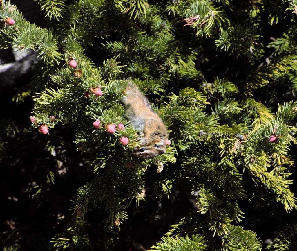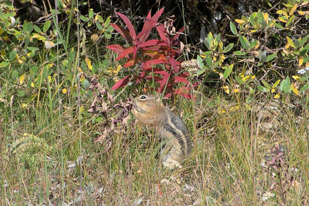 The Least chipmunk has 4 toes on its front feet, 5 toes on its hind feet and runs with its tail in a vertical position. This enables them to move rapidly while maintaining their balance. On a number of occasions I saw how quick and shifty they could be as they would scoot in and out of the front doorway of the lodge. The Least chipmunk is one of the smallest of its species and their coats are a much darker brown with black and white stripes in the summer that turn to gray in the winter. Like their cousins the marmots they communicate warning one another with chirps and squeaks.