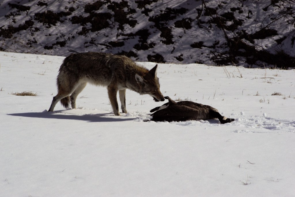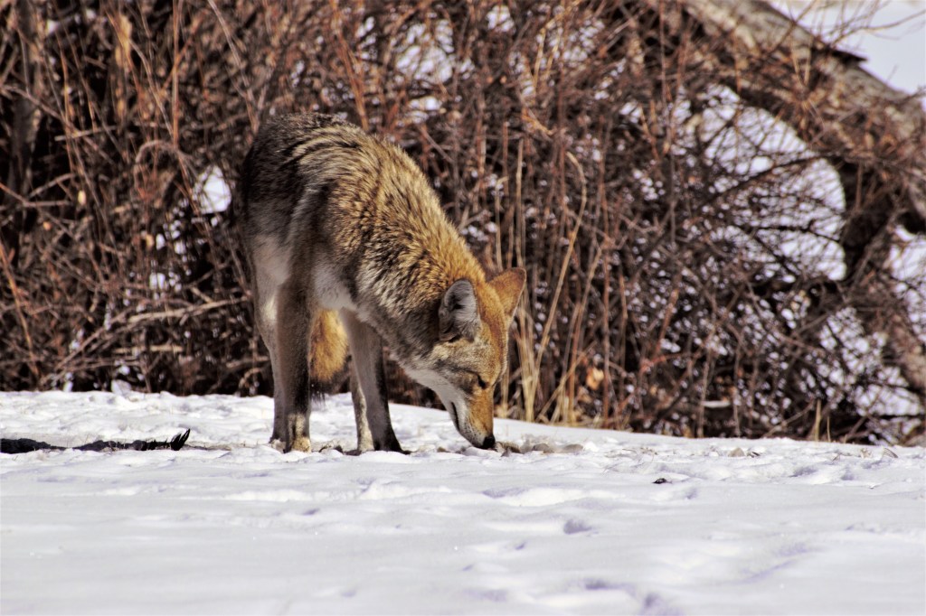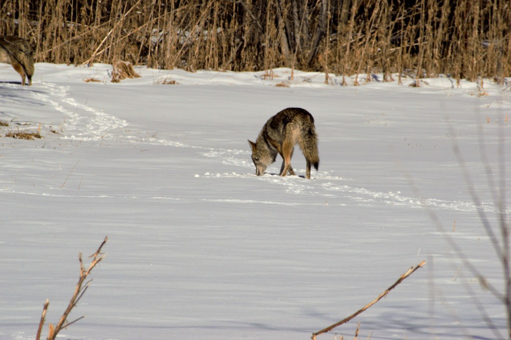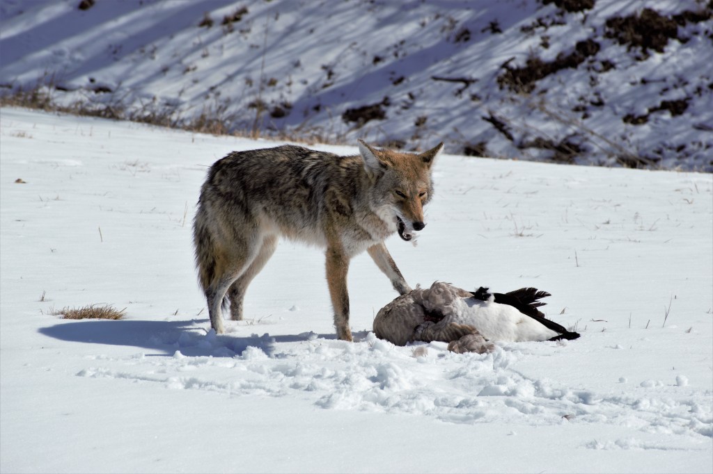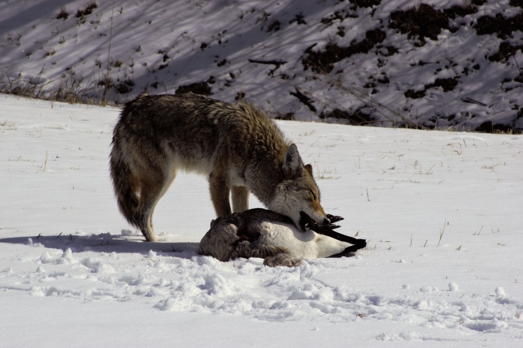 Coyote have very sensitive ears designed for finding prey and after a snow storm I have found them hunting for rodents. They focus their full attention to a very small area using their sense of smell and listening for the slightest movement in the snow shifting as a rodent incorrectly thinks it is hidden. Eventually the coyote will pounce into the snow attempting to catch its prey. Sometimes they will snatch it on the first attempt often they do not and will patiently concentrate again to repeat the process until they trap the rodent and earn a meal. I have seen my dog Chip also hunt for voles like this and he is on a 6 foot leash. Carrion as you can see from the pictures of the coyote eating a goose carcass is certainly on the menu for them.