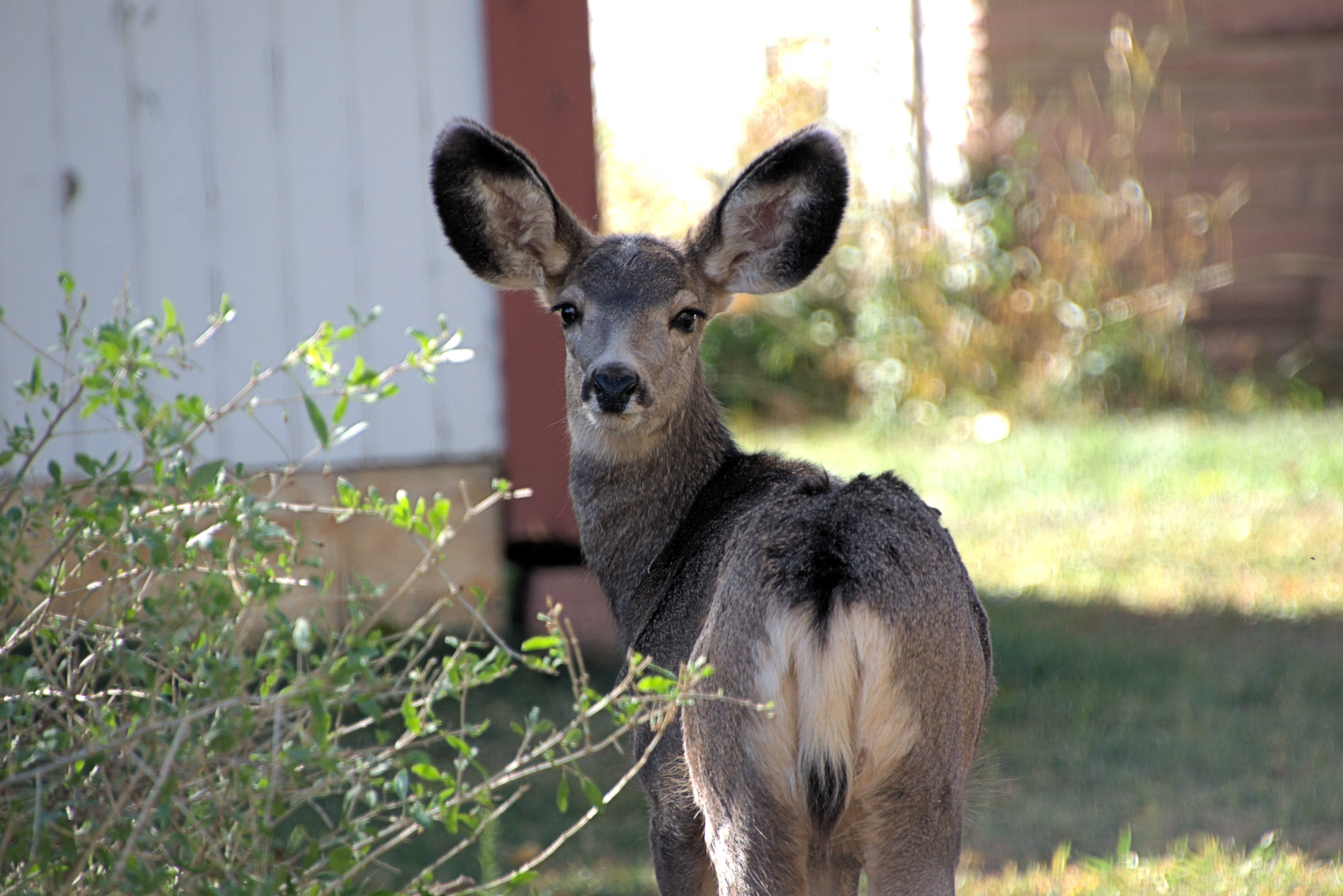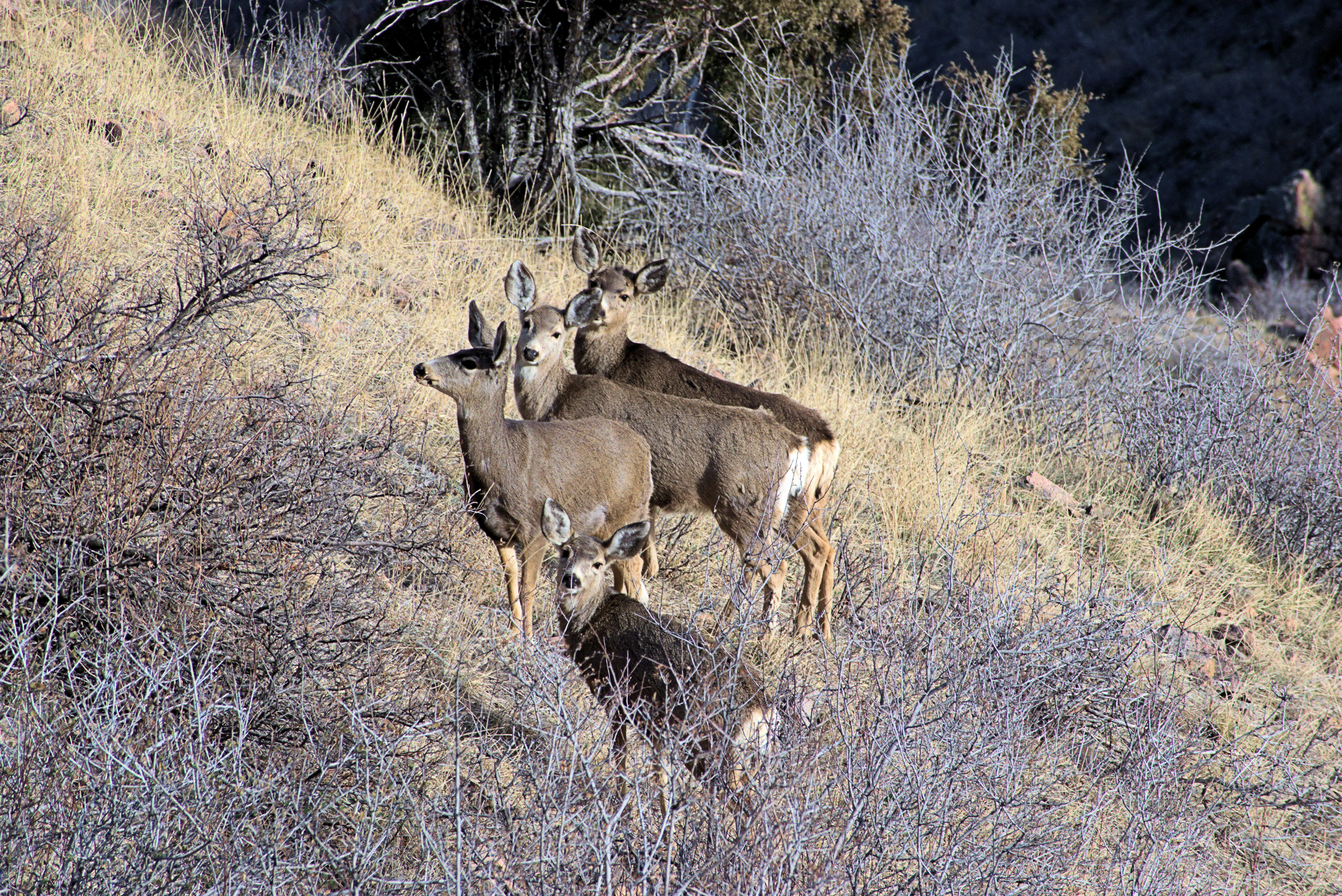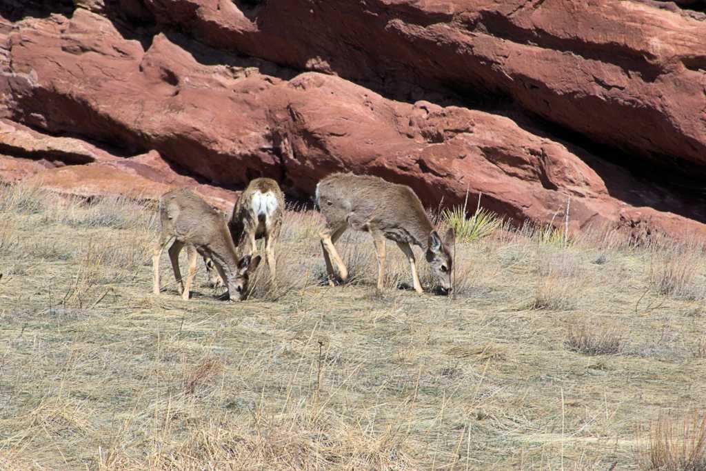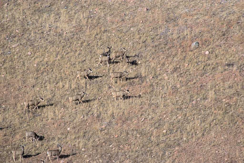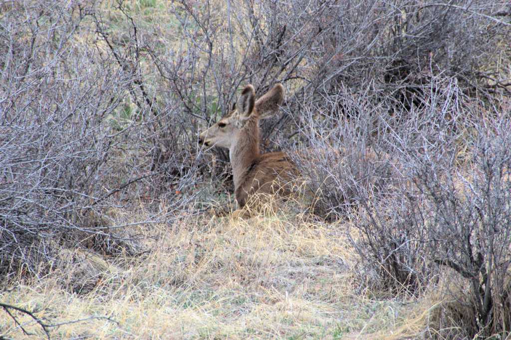 There are two species of deer in Colorado, mule deer “mulies” and whitetails and I have been able to see both while on WaltAbout. My sightings of mule deer have been just about daily all over the state. I have seen white-tails solely at the Rock Mountain Arsenal (RMA) Natural Wildlife Refuge. The I-25 freeway running north to south is basically the separation point for the two species. Mule deer run stiffly and will when threatened start bouncing on the rugged terrain while escaping this is called stotting. They get all four hooves off of the ground to do this which takes a lot of energy so it is only done sparingly. They can easily exceed ten feet in their jumps. Whitetails have a much more graceful gate and can be identified by their white tails that they wave when they run while distressed.