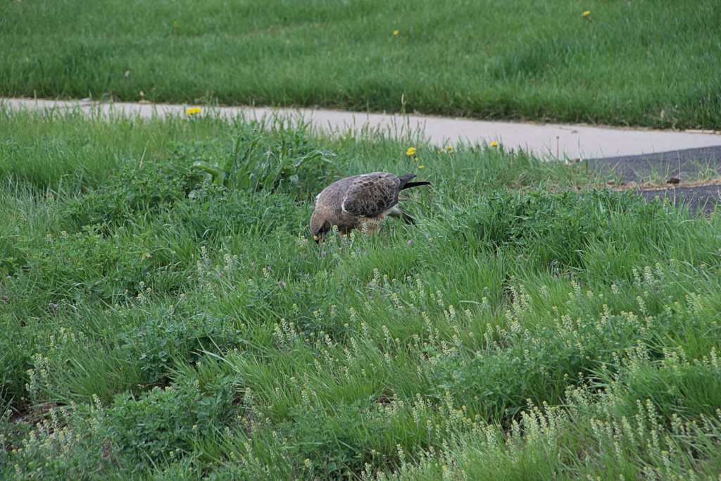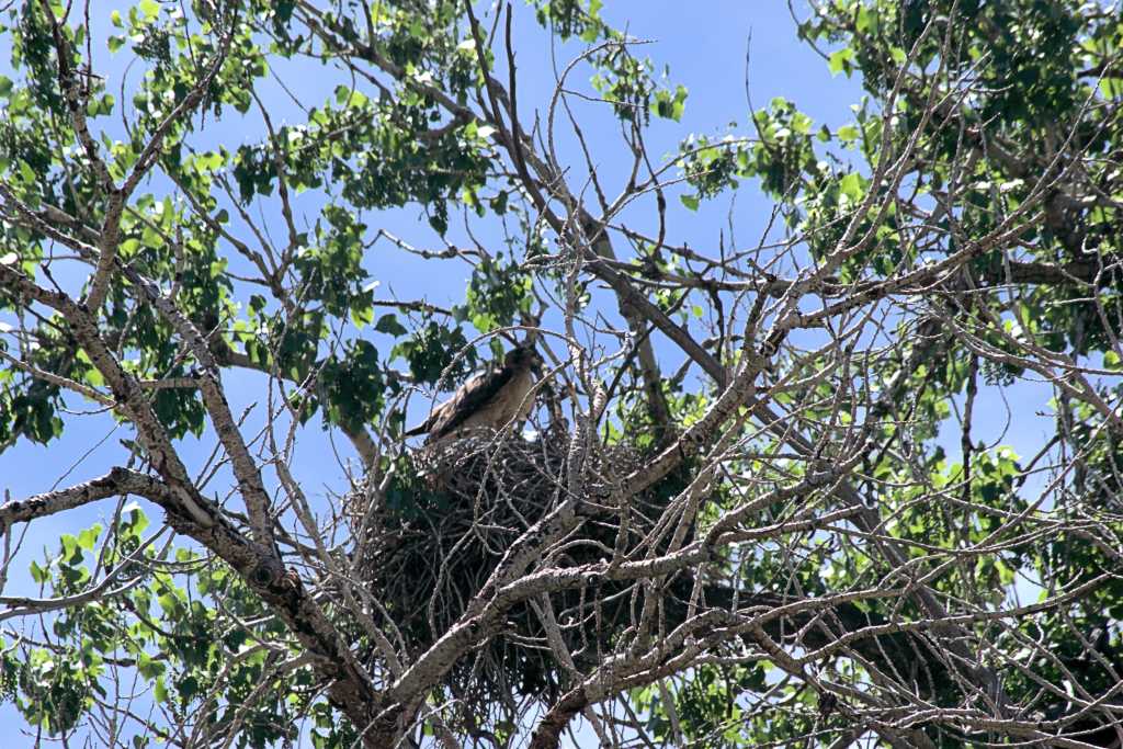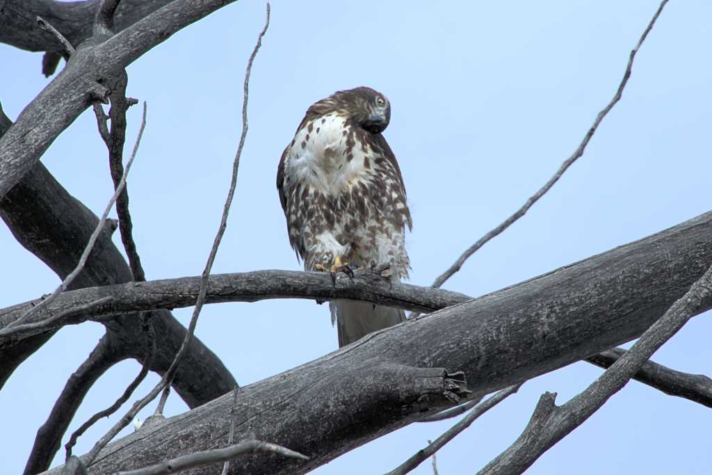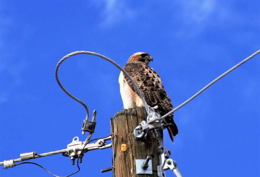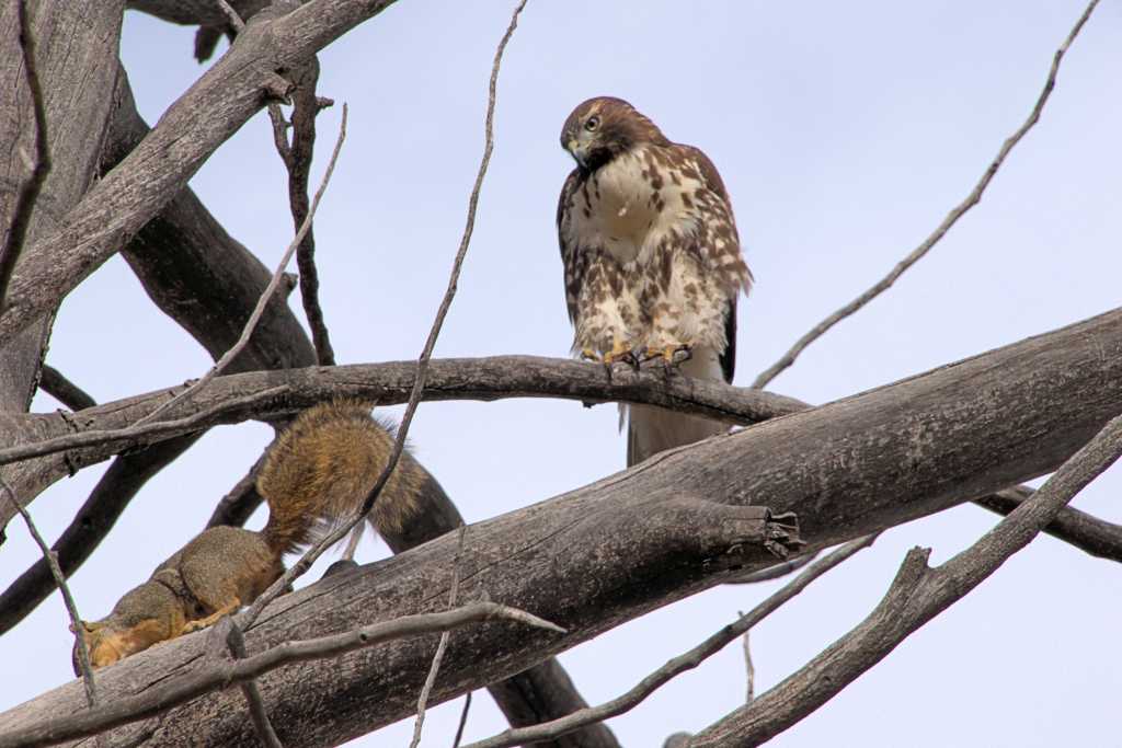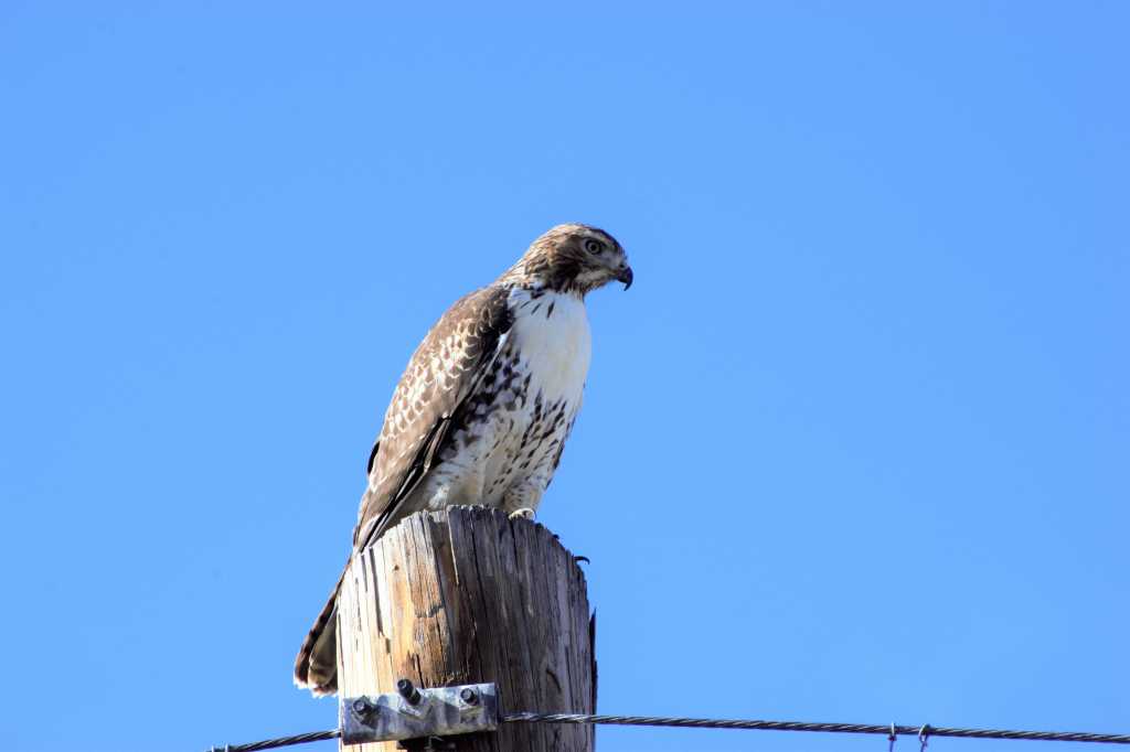 I have frequently seen Red-tails flying above the open fields. Most of the time they are hunting as they catch the thermals that are often there but in the spring they are also courting and mating. In the spring I have seen the males fly erratically including multiple dives for no apparent reason to get the attention of a female. If they become a pair they fly together in circles and will lock their talons together during death defying dives which can be hundreds of feet of descent. Red-tails form strong bonds and mate for life. Just like the eagles they share the parenting activities for their baby hawks which are called eyas. They build their nest together in a tree or cliffside that are made with sticks and leafy branches. Once the eggs have been laid they will both work at incubating them for right around a month. After the birth of the eyas the male will go into heavy hunting mode and both parents will feed them. At this time their preference for prey seems to be snakes which are easier to cut into small pieces and they do not have to be skinned.