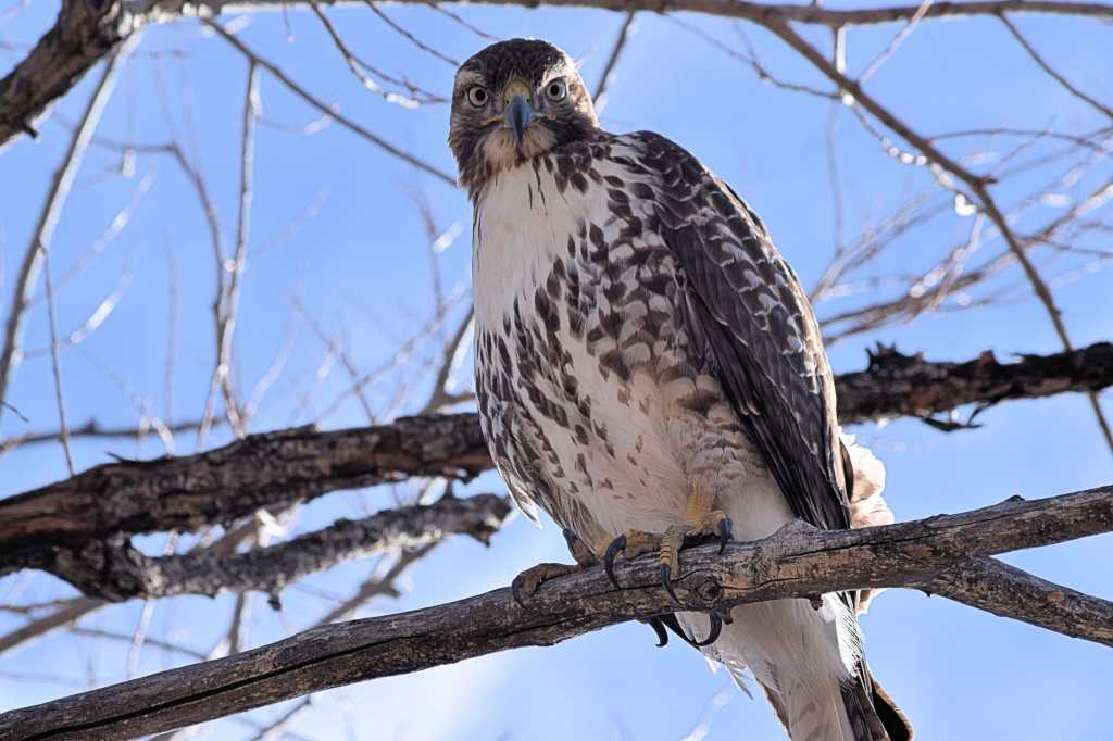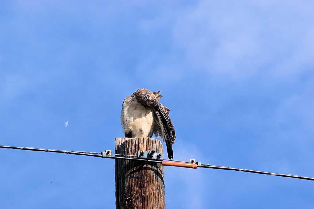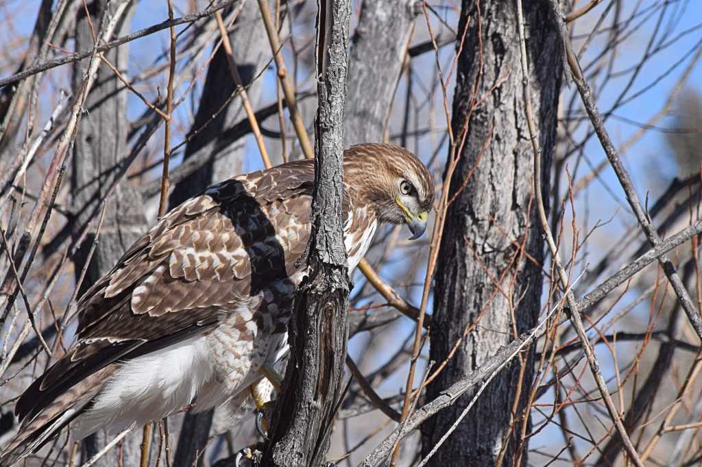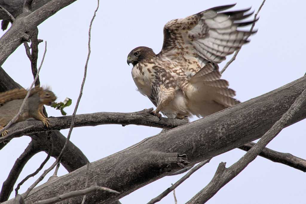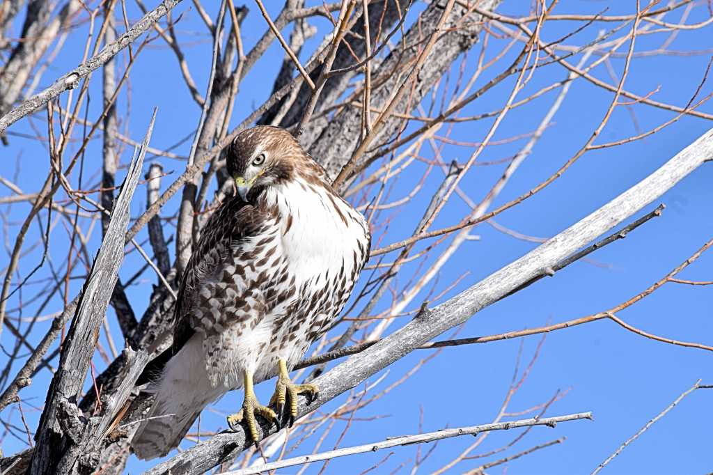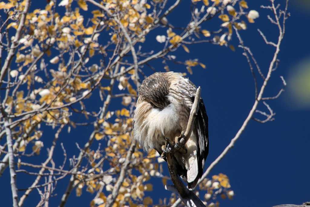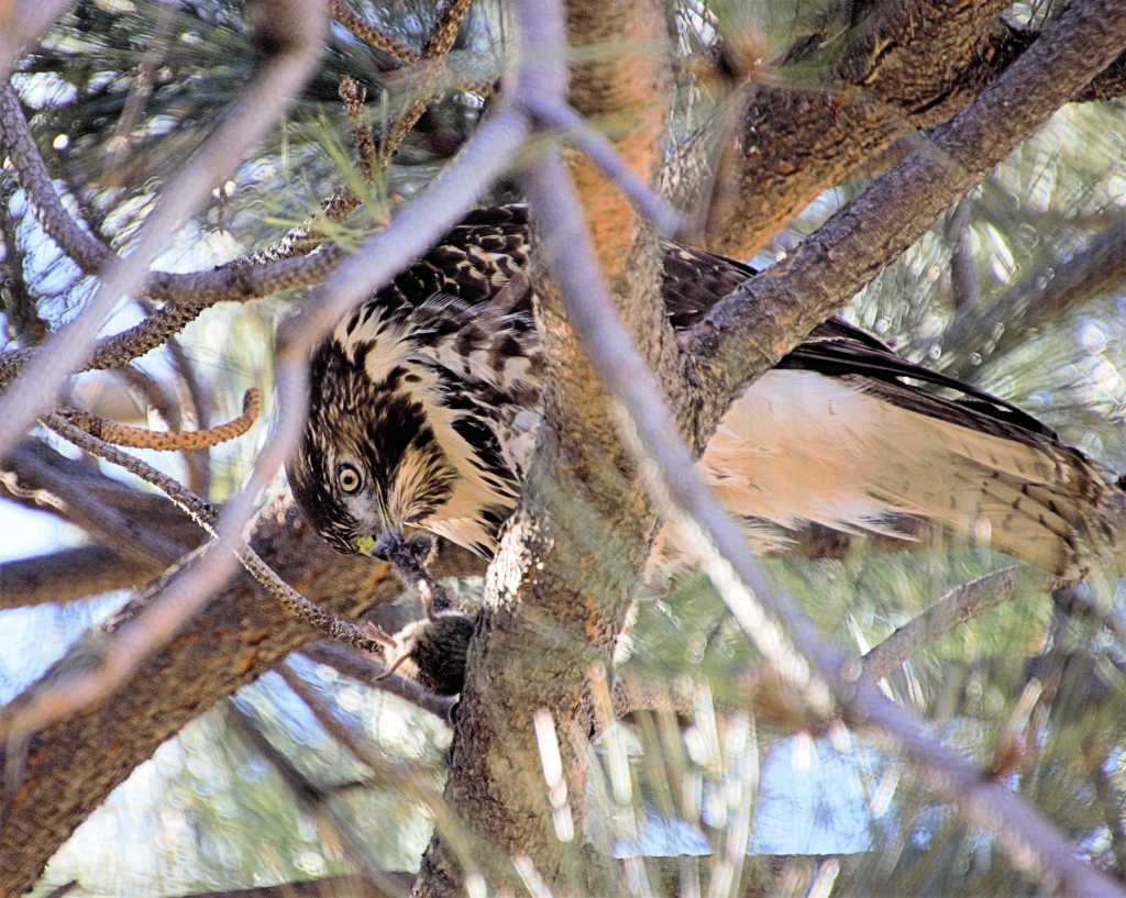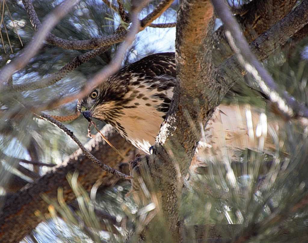 The Red-tails are smaller than their fellow raptors the bald eagle with a wingspan of about 44 to 50 inches and a body length of up to 25 inches. Females are larger than the males as is consistent with raptors Reverse sexual dimorphism characteristic. Despite the size disparity this regal species is an avid hunter that has exceptional flying skills. I never knew that birds have a third eyelid before watching the Red-tails and noticed them using it at times. Cold, wet and windy weather can occur anytime in Colorado. The third eyelid, called a nictitating membrane that nature has supplied avians with helps to overcome the elements and also provides an additional layer of protection when they are capturing prey and consuming it.