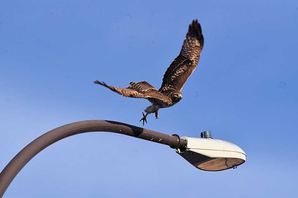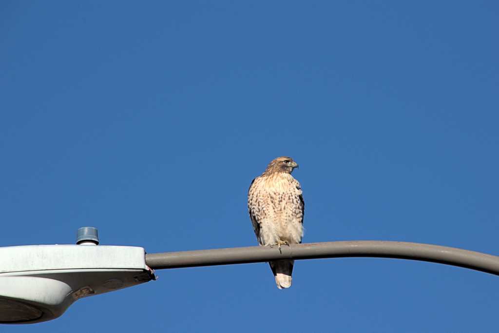 Red-tailed hawks are redoubtable hunters with keen eyes, bone crushing talons and an extremely sharp beak. Rodents are plentiful here and they seem to prefer them as a regular part of their diet. They perch on street and light poles above the restaurants in the neighborhood waiting for the rodents to feed in the dumpsters. Sooner or later one will show and the Red-tail will swoop down, grip it with its talons and take it to a spot of safety to feed on. They also eat snakes, frogs, insects and fish.